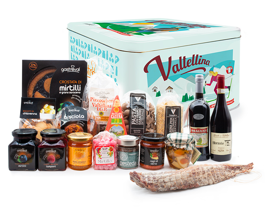 Il cofanetto Fellaria è la selezione dei migliori prodotti valtellinesi per un regalo che lascerà sicuramente senza parole. La strenna è pensata per deliziare i sensi anche dei più esigenti, in primis con il gusto inconfondibile del Braulio riserva, che, pur risaltando, non oscura certo l’importanza degli altri prodotti della selezione. Il vino è uno Sforzato di Valtellina superiore DOCG. Slinzega, Casera DOP, pizzoccheri della Valtellina IGP completano l’assortimento di delizie valtellinesi. Per terminare in dolcezza, il miele di produzione valtellinese accompagna le dolci chicche di pasticceria e le golosissime confetture di lamponi e di mirtilli. Lasciatevi tentare.