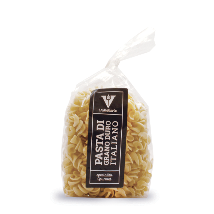 La pasta di grano duro Valtellerie è realizzata con grano coltivato e macinato interamente in Italia da filiera certificata. La pasta viene prodotta aritigianalmente utilizzando le tradizionali trafile in bronzo attraverso un essicazione lenta a bassa temperatura.